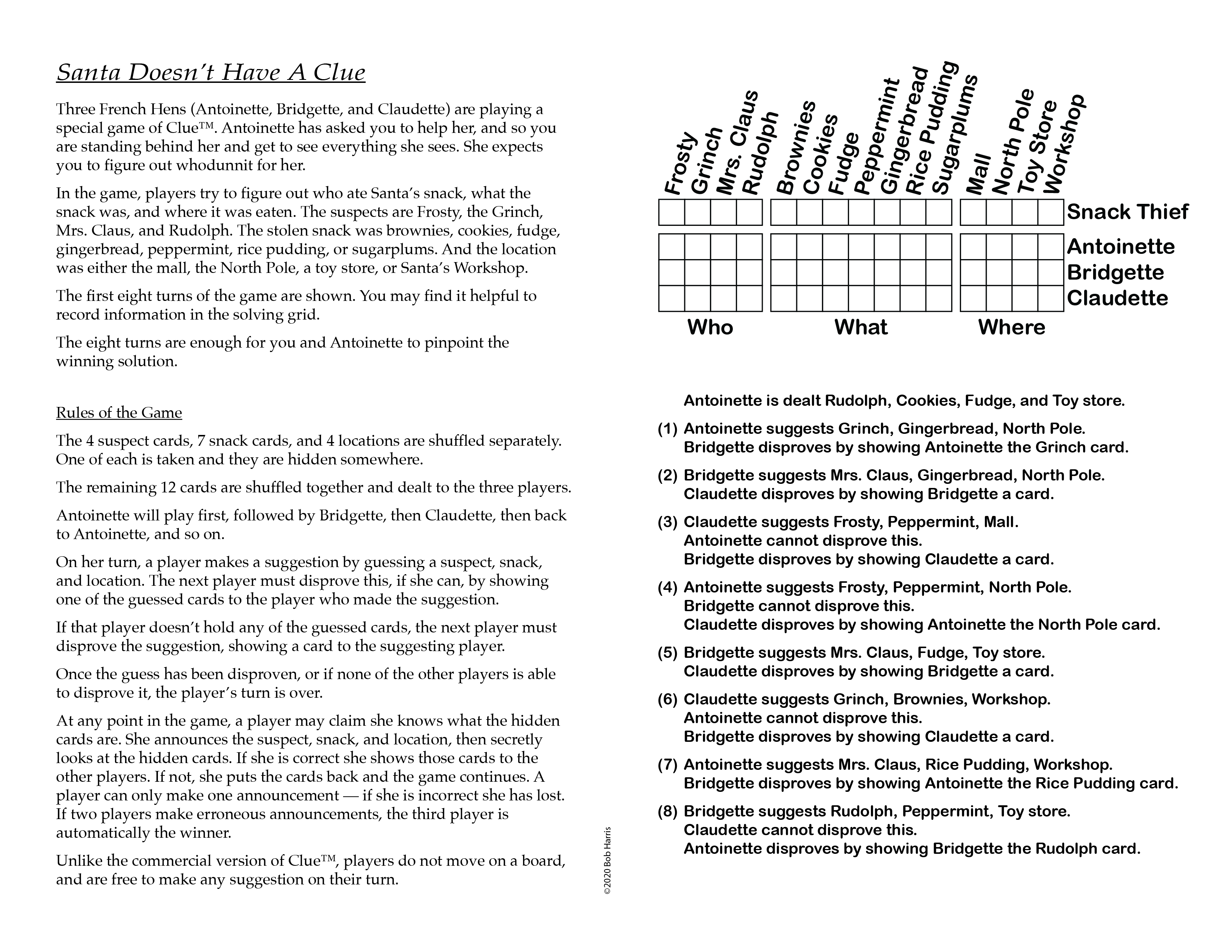 game of Clue™. Antoinette has asked you to help her, and so you are