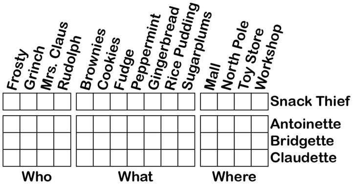 snack was, and where it was eaten. The suspects are Frosty, the Grinch, Mrs.